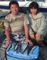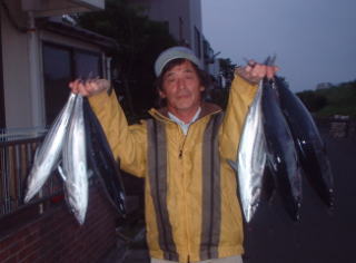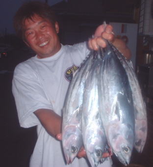 | コメント | 今日は火曜日で片倉ボートは休みです。朝起きたら海はなぎ、エルボーの高松君から電話で千波で5キロくらいのカツオが釣れていると連絡があり行ってみた。横さんと千波に向け9時半出発、大島の手前でなぶら発見仕掛けをおろしたら2匹釣れた。魚は小さいがそれを見ていた漁師が2〜3隻集まってきた千波の方からも来る。向こうはだめみたいだだからそこでがんばった。シラスを追っていて食いは悪かったが何とか20本釣った、他の漁師もあんまり釣れて無かったみたいだからこんなもんかな?今年の初カツオ!! | ||